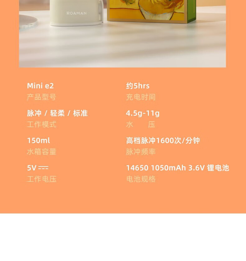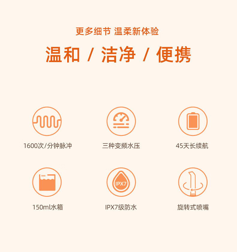 +1600次/分高頻脈沖,0.6mm細膩水柱 +3種私藏模式,4.5-11g溫柔水壓,柔軟體驗 +可360°旋轉噴嘴,采用FDA食品級材質,1分鐘智能計時 +擁有150ml水箱,輕松使用 +IPX7級全身水洗,可淋浴 +磁吸式感應充電 ,超長續(xù)航45天