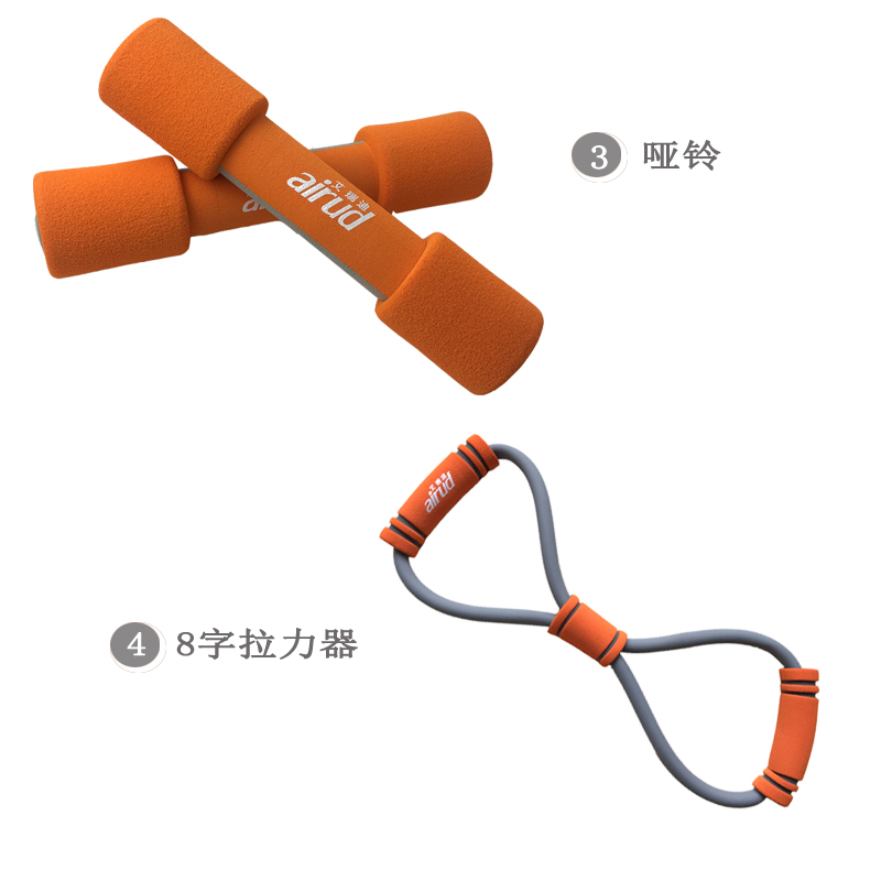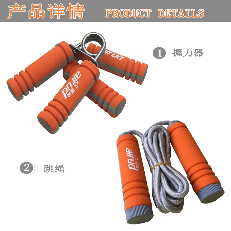 產品介紹:跳繩1條,握力器1個,啞鈴2個、拉力器1條、計步器