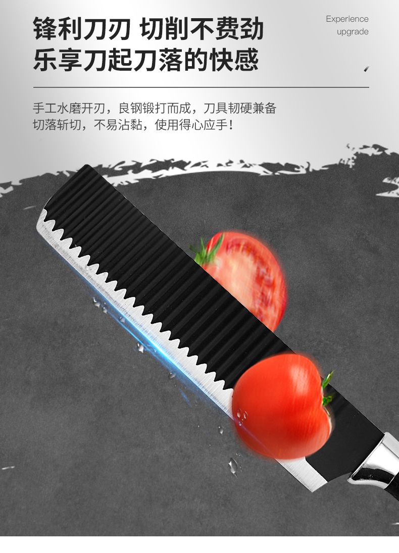 黑鋼硬度高,耐用鋒利,手柄握感輕松舒適,刀刃用心打磨保證鋒利度,六件套滿足廚房所需