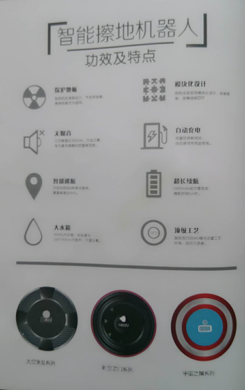 這款產品是最新上市的新款產品,主要功能是拖地。內置有大水箱,可以裝水,自動加濕拖的更干凈。重量輕,有安裝陀螺儀防倒,防撞系統再提升一個檔次。超低音。有弓字型路線覆蓋率可以達到98%。隨時可以更換抹布,更清潔,更健康。愛家從家庭環境開始,提高家庭環境衛生的清潔你最好的選擇是感應智能擦地機。。。