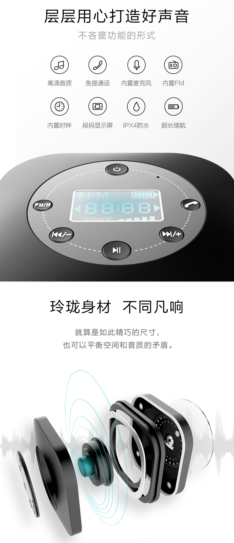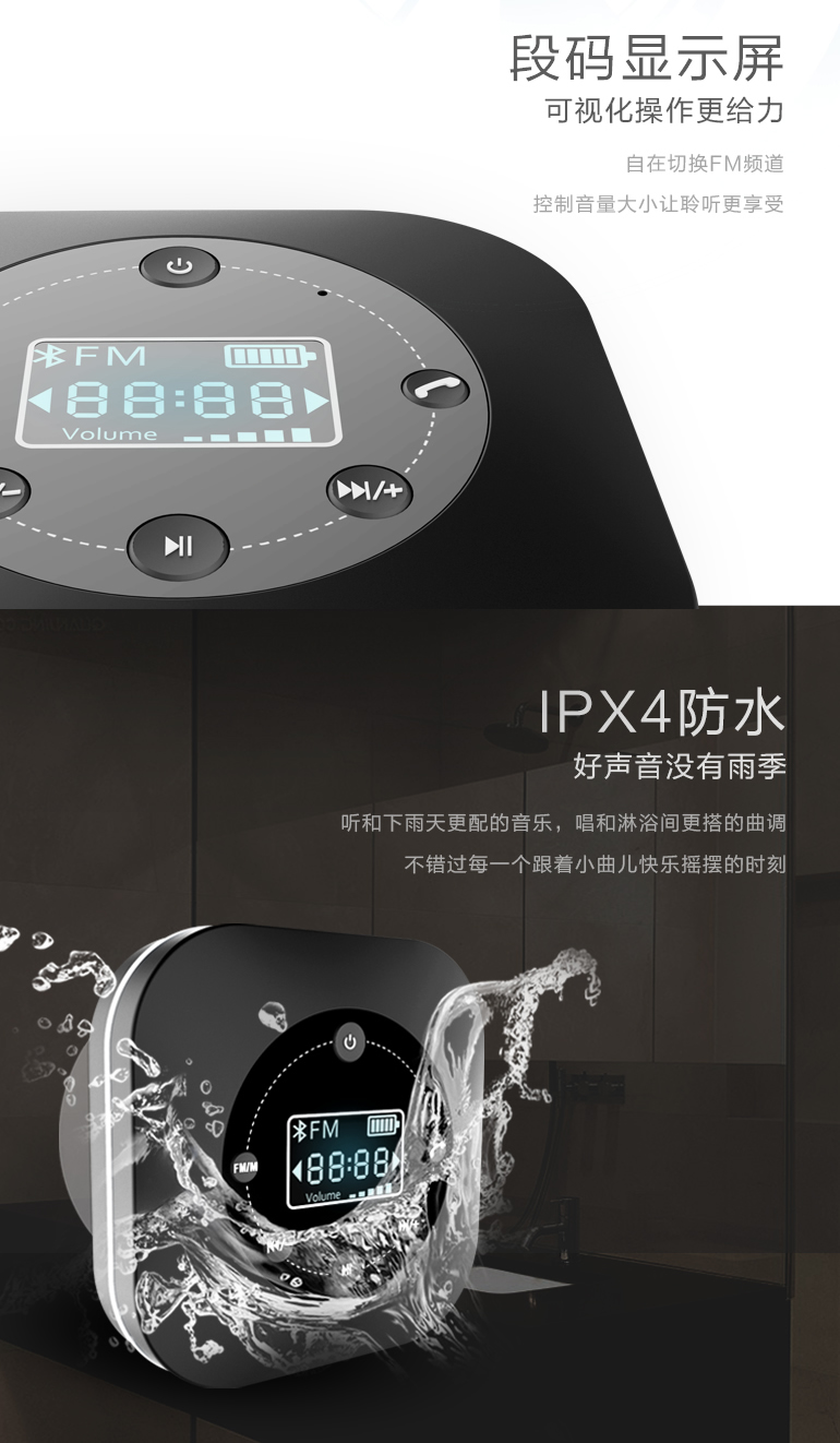 防水,藍牙連接,可接電話,FM收音,時鐘顯示