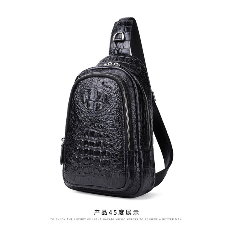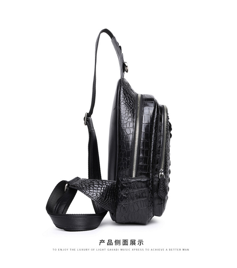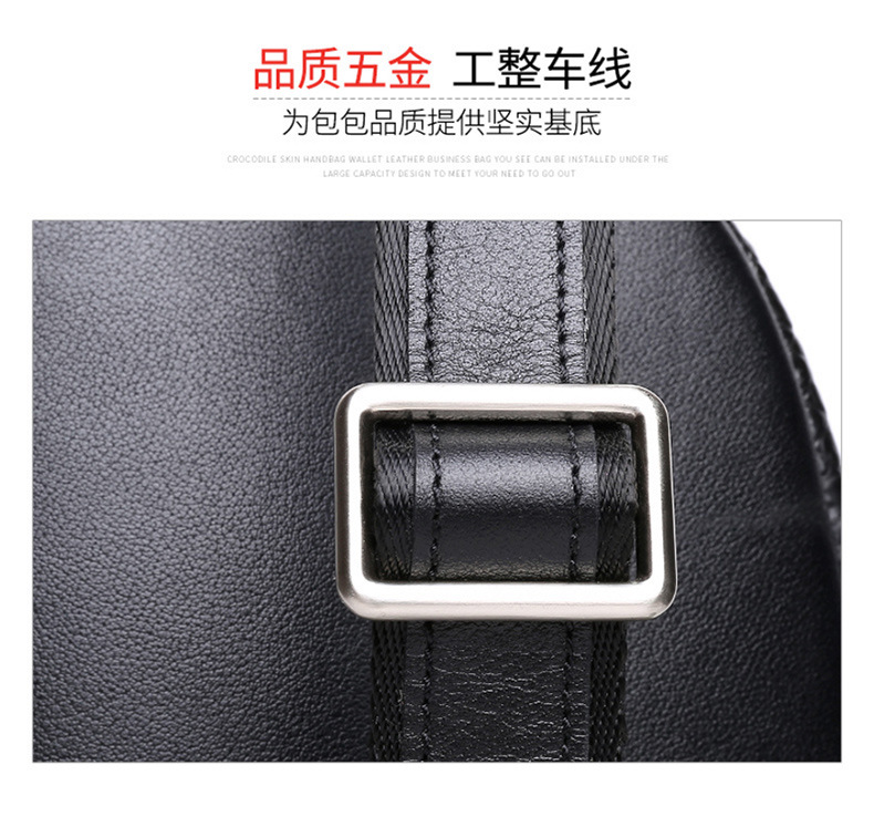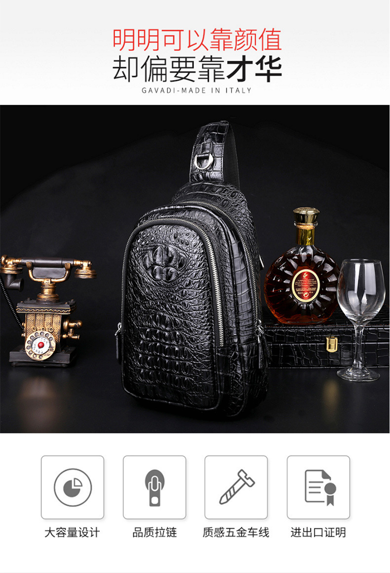 貨號:G1063規格:20cm寬 x 32cm高 x 10cm厚面料:鱷魚皮內襯:牛皮用途:商務、休閑容量:可裝入手機、錢包、香煙紙巾、折疊傘等物品內部結構:1個主袋、1個前拉鏈副袋、1個拉鏈暗袋、1個內貼袋