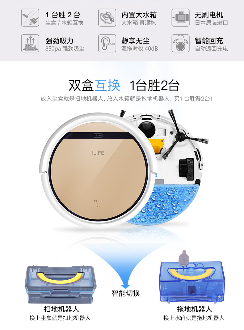 ILIFE 智意 V5S智能掃地機器人拖地機靜音 吸掃干濕拖一體擦地機