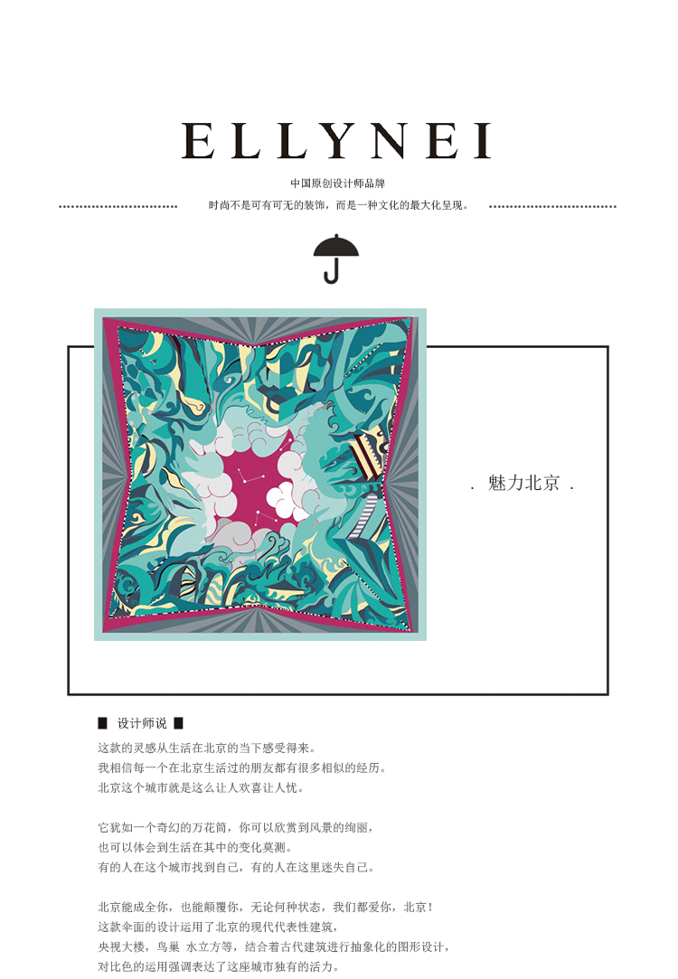這款雨傘的靈感從生活在北京的當下感受得來,我相信每一個在北京生活過的朋友都有很多相似的經歷。北京這個城市就是這么讓人歡喜讓人憂。它猶如一個奇幻的萬花筒,你可以欣賞到風景的絢麗,也可以體會到生活在其中的變化莫測。有的人在這個城市找到自己,有的人在這里迷失自己。北京能成全你,也能顛覆你,無論何種狀態,我們都愛你,北京!