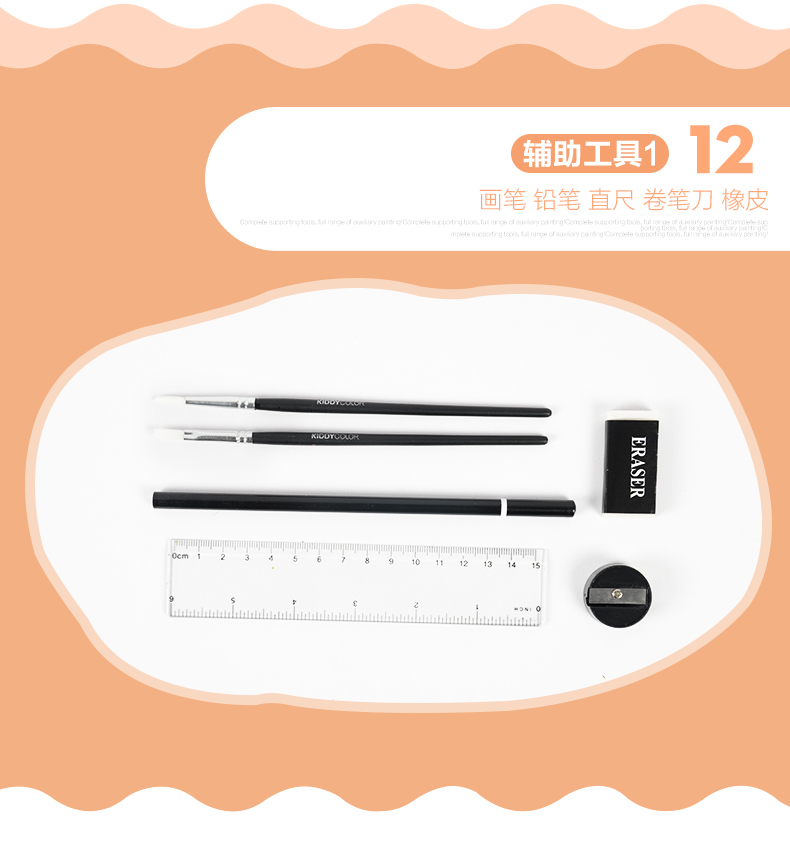 卷筆刀、鉛筆、橡皮、直尺、回形針