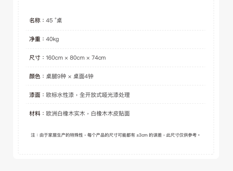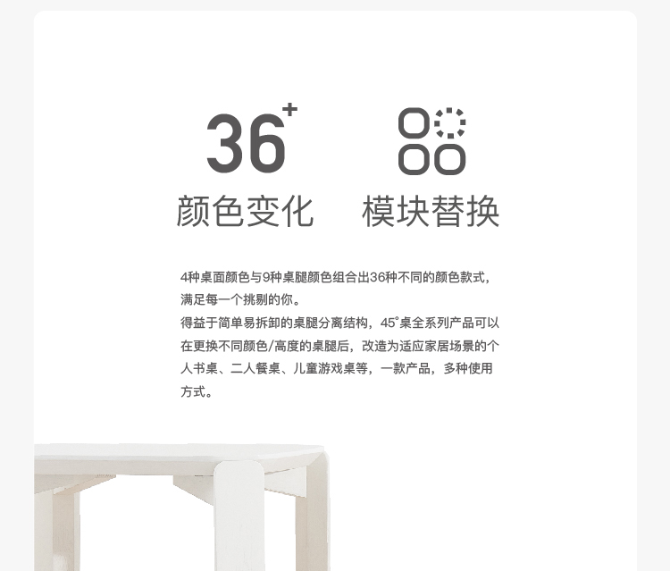 45度桌是一個反抗的產物。為什么桌子需要角,桌角傷人事件常有發生,為什么不取締那尖銳的90度角?將90度斜切,和同樣斜切的桌角重新組成一個全新的無棱角的90度,圓潤的直角。向下斜切的側邊,溫柔收斂,因為氣場從來不是疾聲厲色或者畢露的鋒芒能夠帶來的。 舉報 極有家認證[原創設計]:專屬設計,限量生產,只為你造 商家承諾:提供“免費送裝”服務,百城內包物流、包配送、包安裝
