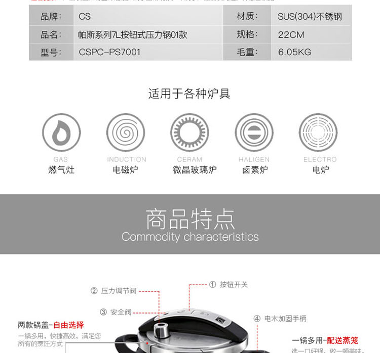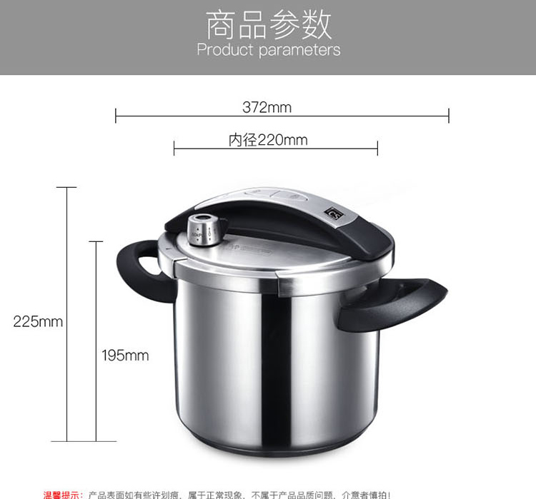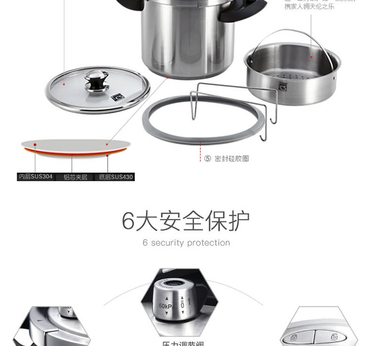 商品名稱:德國CS 304不銹鋼22cm壓力鍋高壓鍋 電磁爐煤氣灶通用 7L