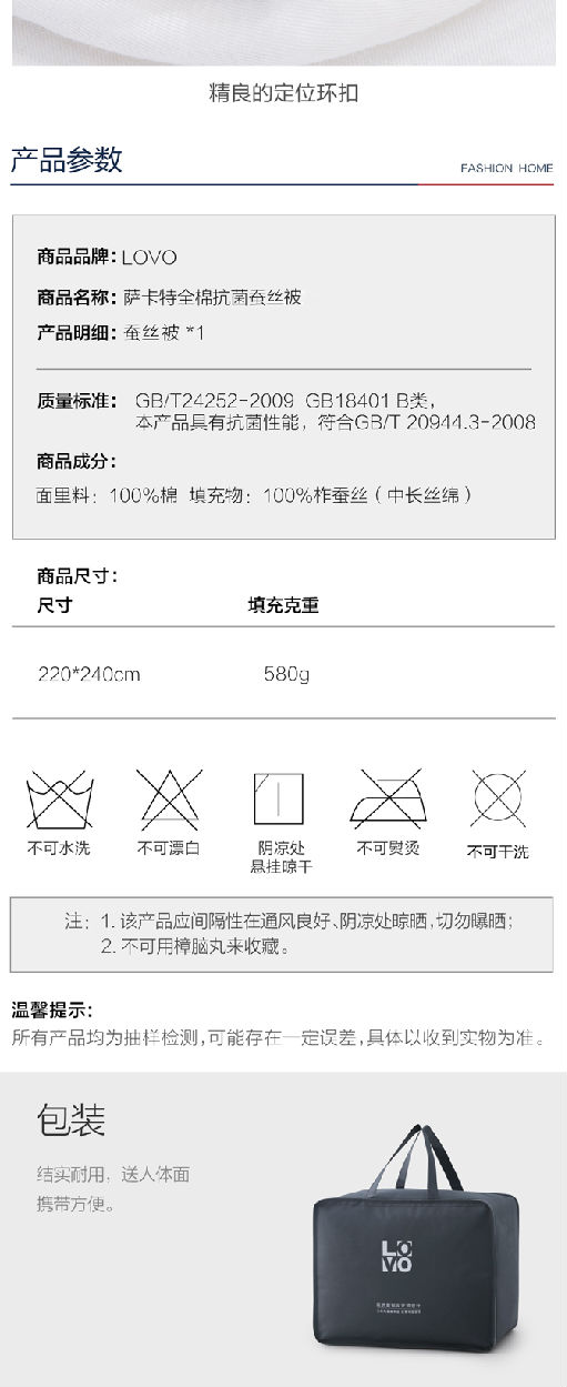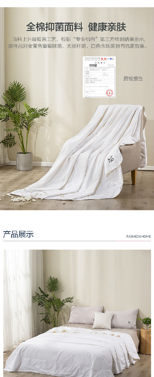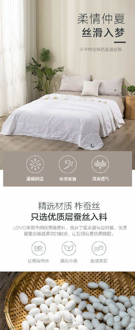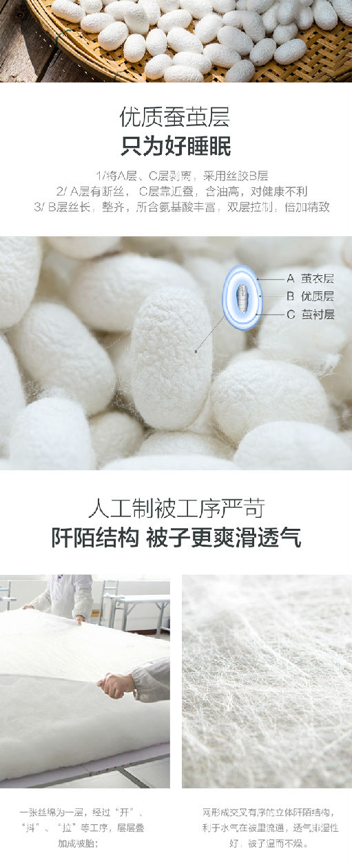 精選材質柞蠶絲,只選優質層蠶絲入料,只為好睡眠;人工制被工序嚴苛,阡陌結構被子更爽滑透氣;全面抑菌面料,健康親膚。
