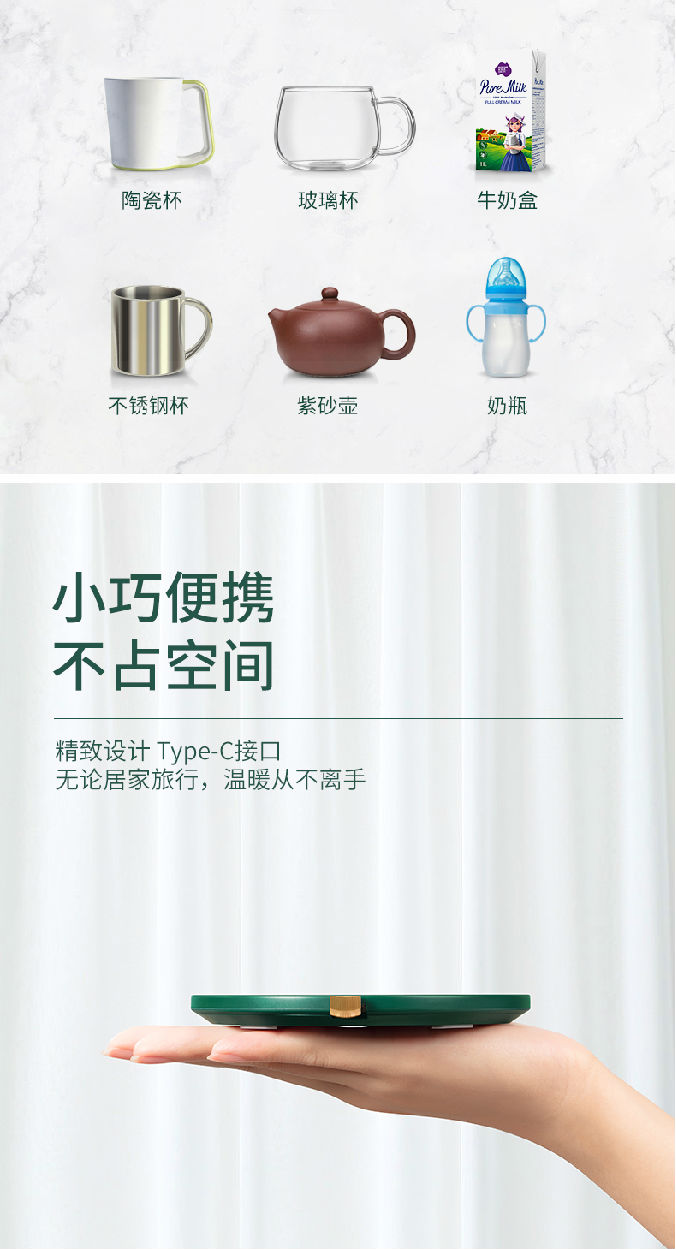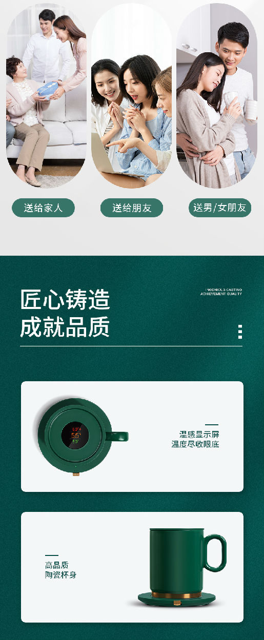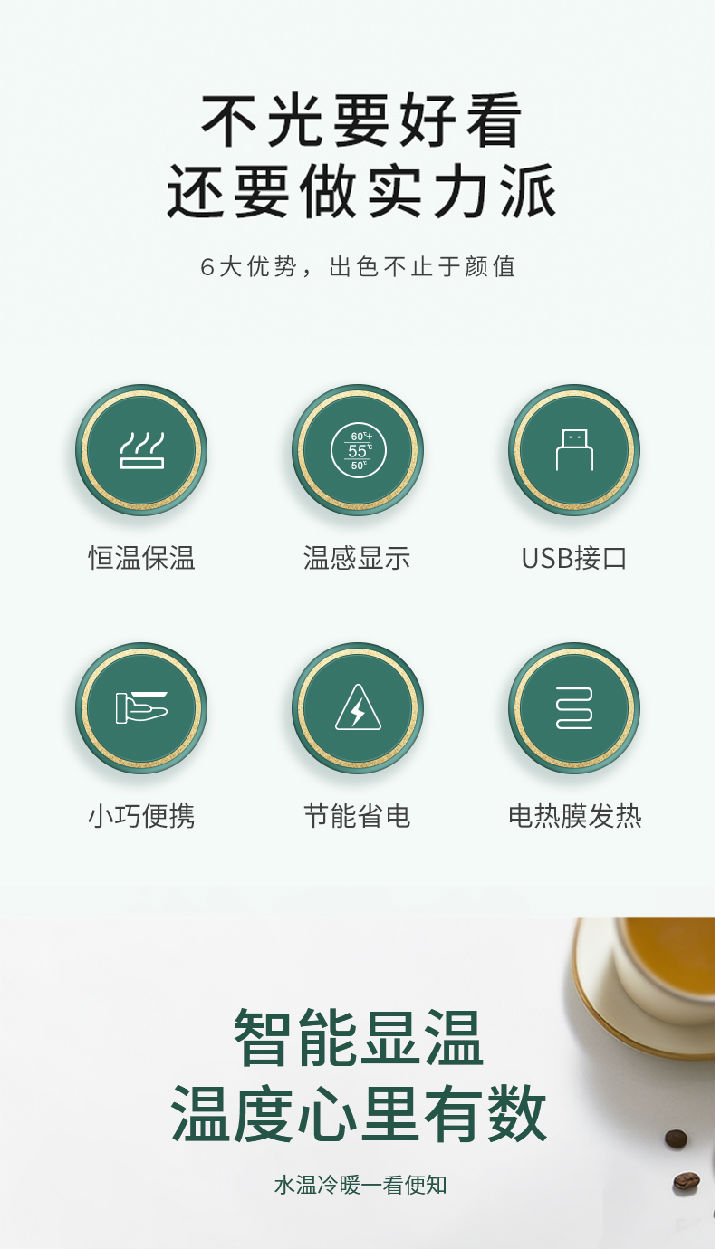 1、USB數據線鏈接,耗能更低,更節能 2、超薄底座,體積小,更節省桌面空間 3、制做精美,采用當下最流行的復古綠 4、杯蓋智能數字顯示,時刻掌握杯內水溫 5、持續恒溫55-60度之間,隨時都能喝到溫水