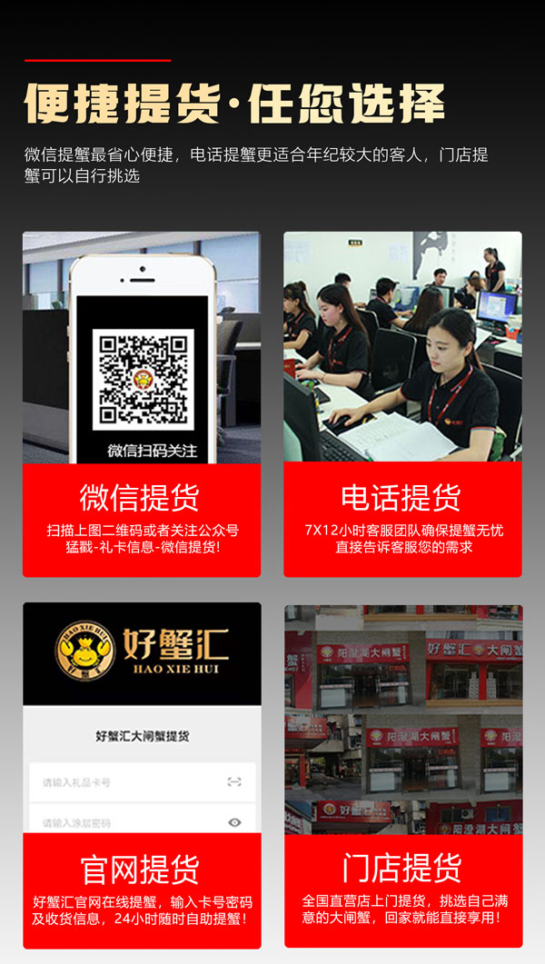 商品特色:蟹卡全國通提,免費順豐發貨,提貨便捷:可微信提貨電話提貨掃描二維碼提貨推薦門店提貨