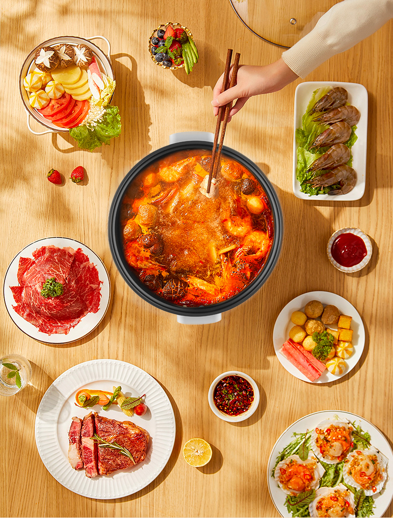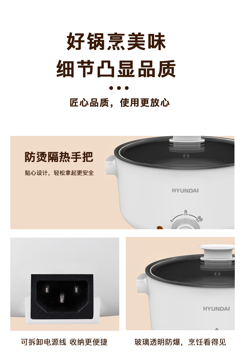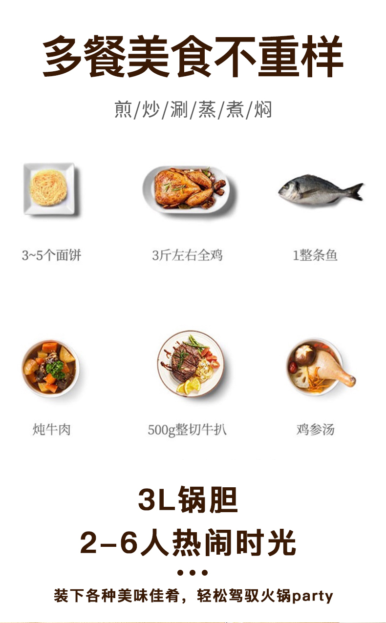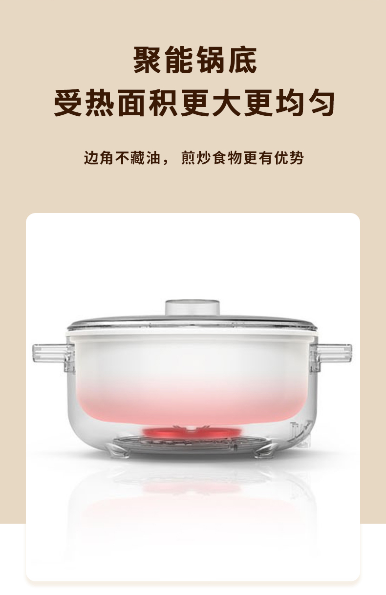 1、3L大容量深鍋,兩檔火力調(diào)控,輕松掌控火力; 2、可視化玻璃蓋,烹飪狀態(tài)隨時(shí)可見 3、不沾涂層,輕油少煙,易清洗 4、防干燒保護(hù),高溫/干燒自動(dòng)斷電; 5、隔熱大手柄,輕松拿起更安全 6、可拆卸電源線插孔,硅膠防滑腳墊。