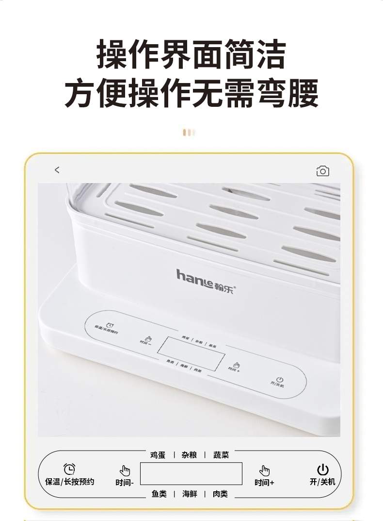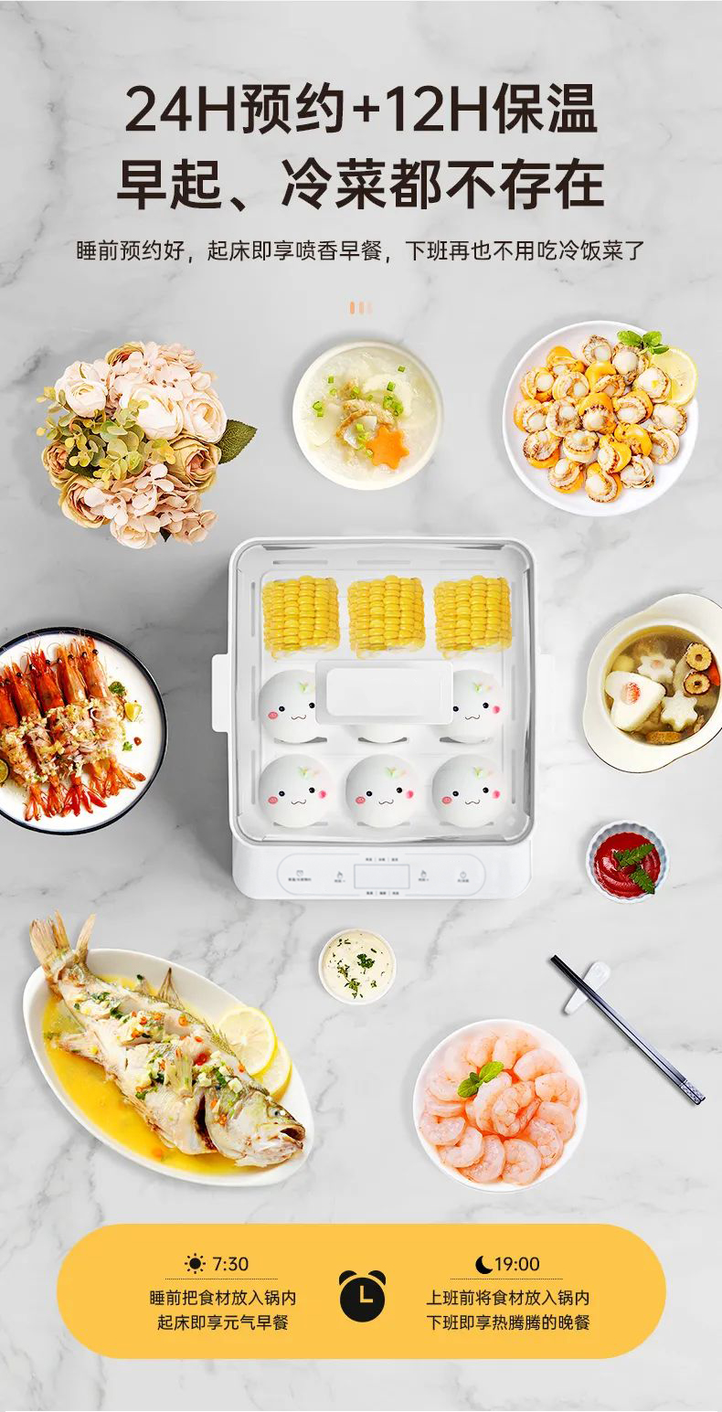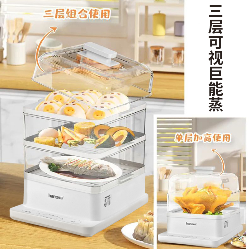 多功能電蒸鍋,360°可視,總容量高達24L,分層蒸不串味,聚能噴發蒸汽,凈水污水分體設計,易清潔更省心,防干燒保護,免看管更安全,可視化機身,烹飪看得見,24h預約+12h保溫,加寬加高設計,可整只雞連盤一起蒸,可容下9個包子左右充分利用邊邊角角,分體式接汁盤,操作界面簡潔,方便操作,缺水自動斷電,不怕干燒,智能溫控保護,折疊收納,更省空間,觸控預約,蒸籠材質:食品級PC材質,蒸隔材質食品級PP材質,發熱盤材質食品級304不銹鋼