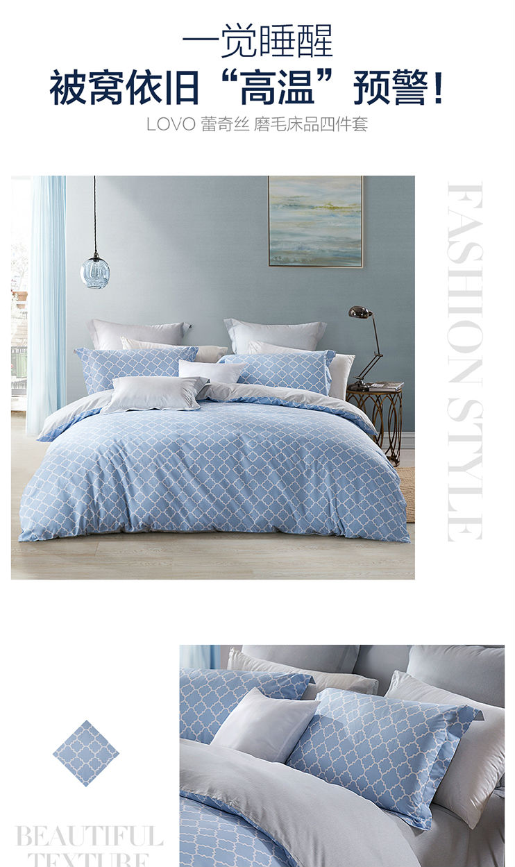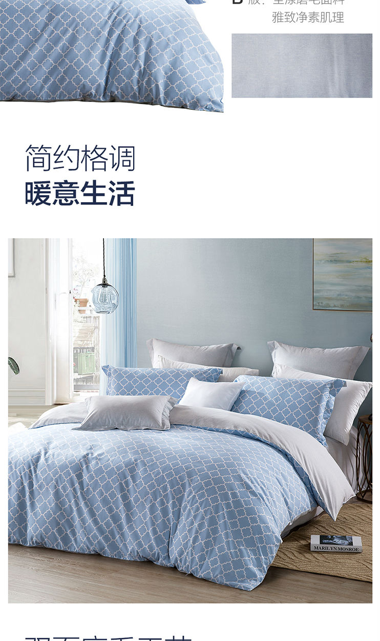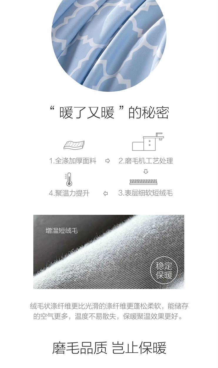 用高密磨毛印花面料,活性印染,圖案逼真艷麗,輕柔磨毛工藝,觸感更為柔軟順滑,倍感溫馨與溫暖。