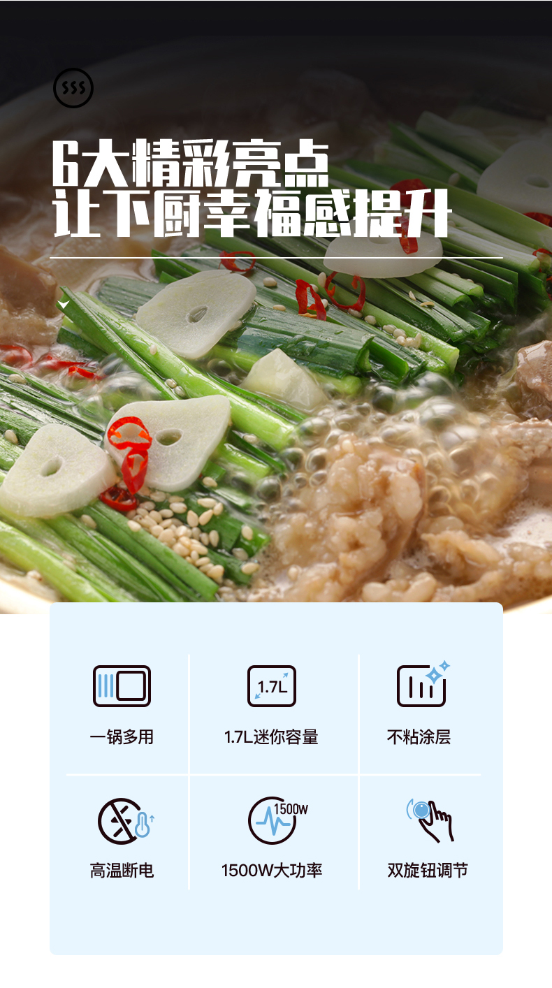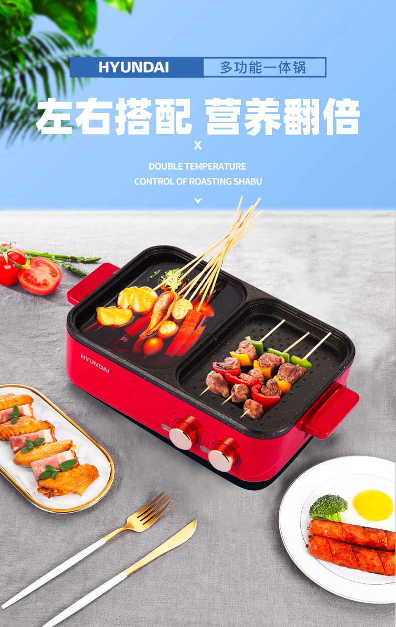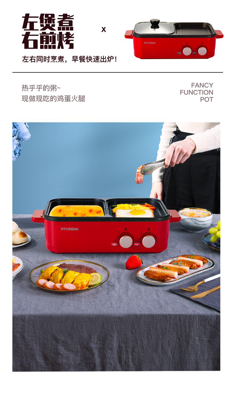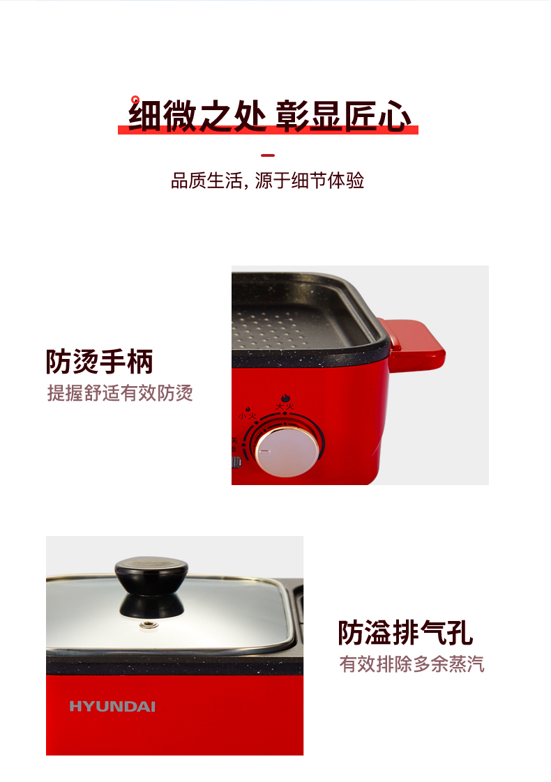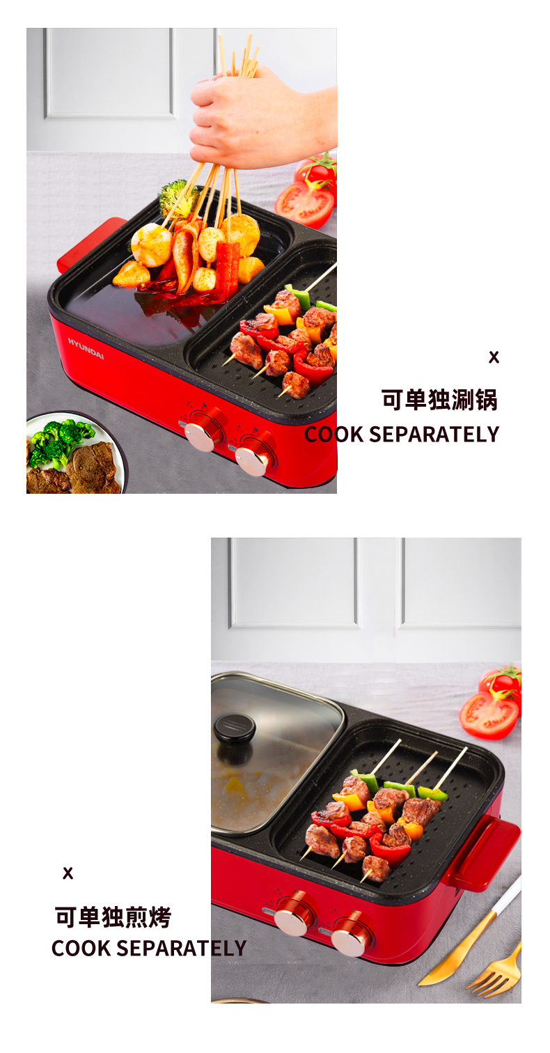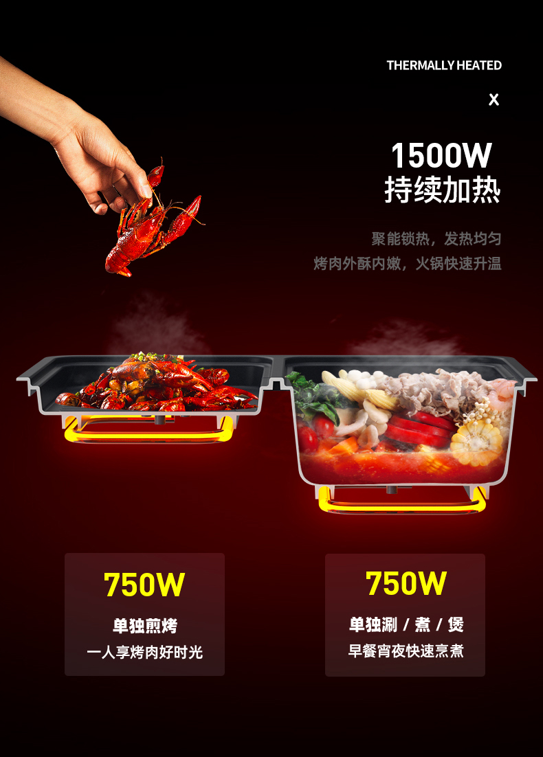1、兩檔火力,雙鍋分區獨立溫控,一鍋多用,小聚派對理想選擇; 2、內膽采用不粘涂層,耐高溫,省電省油,不焦不粘少油煙 ; 3、一體壓鑄全密封設計,清洗更便捷; 4、拆卸式電源線,方便收納與清潔; 5、可視化玻璃鍋蓋,隨時把握烹飪進度; 6、底部防滑墊+散熱孔,放置穩當,散熱快 。