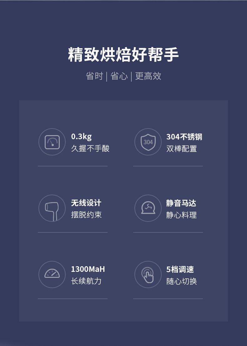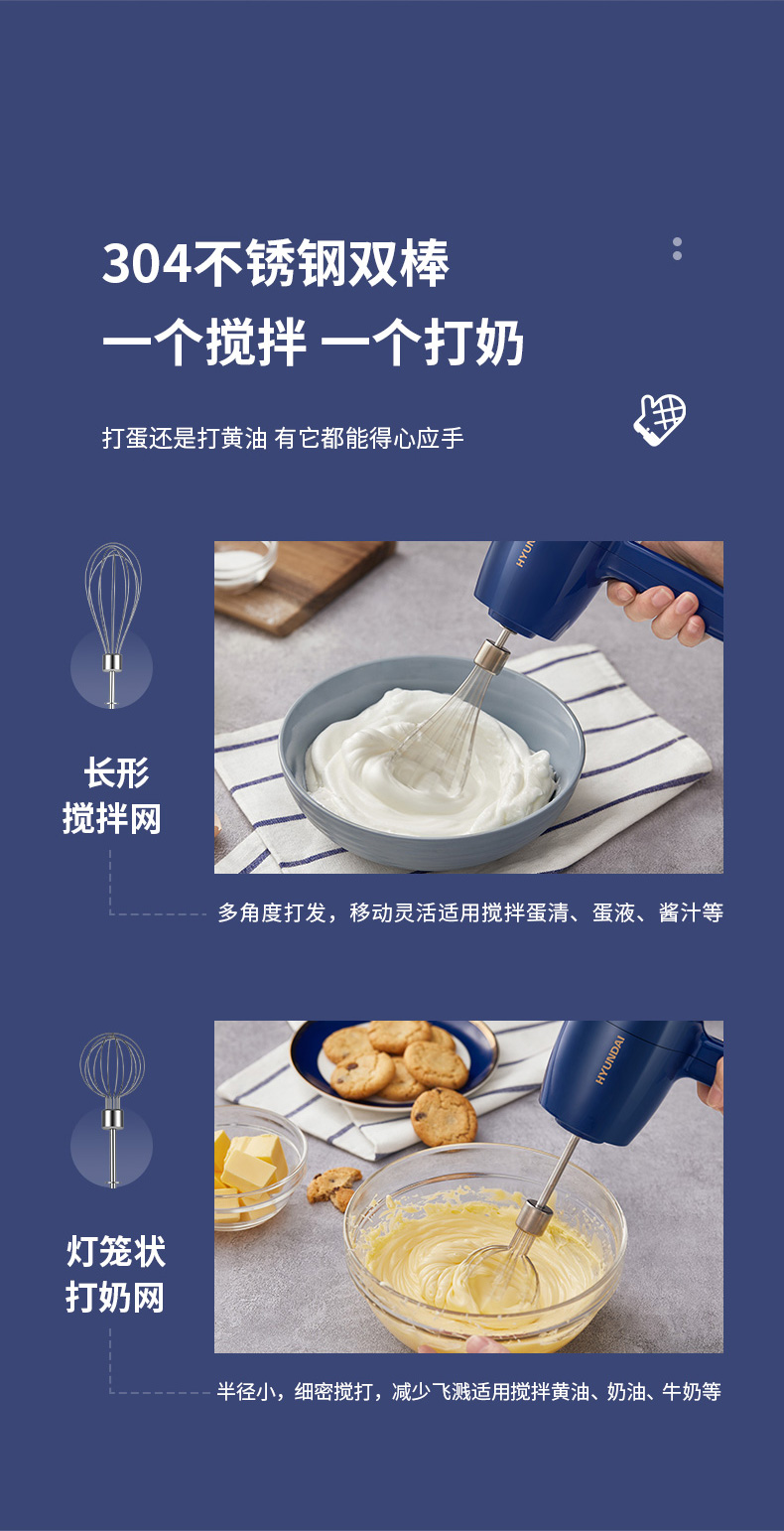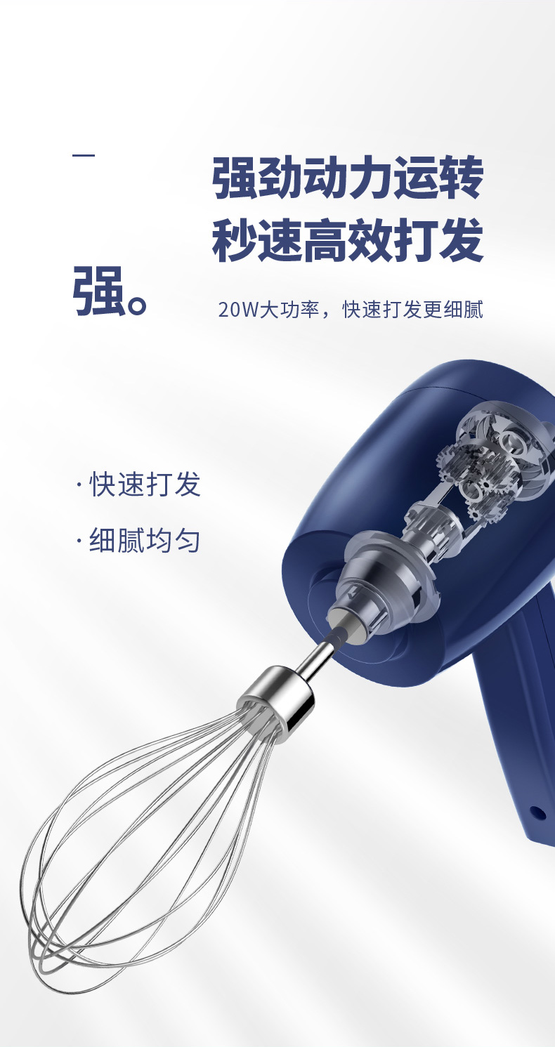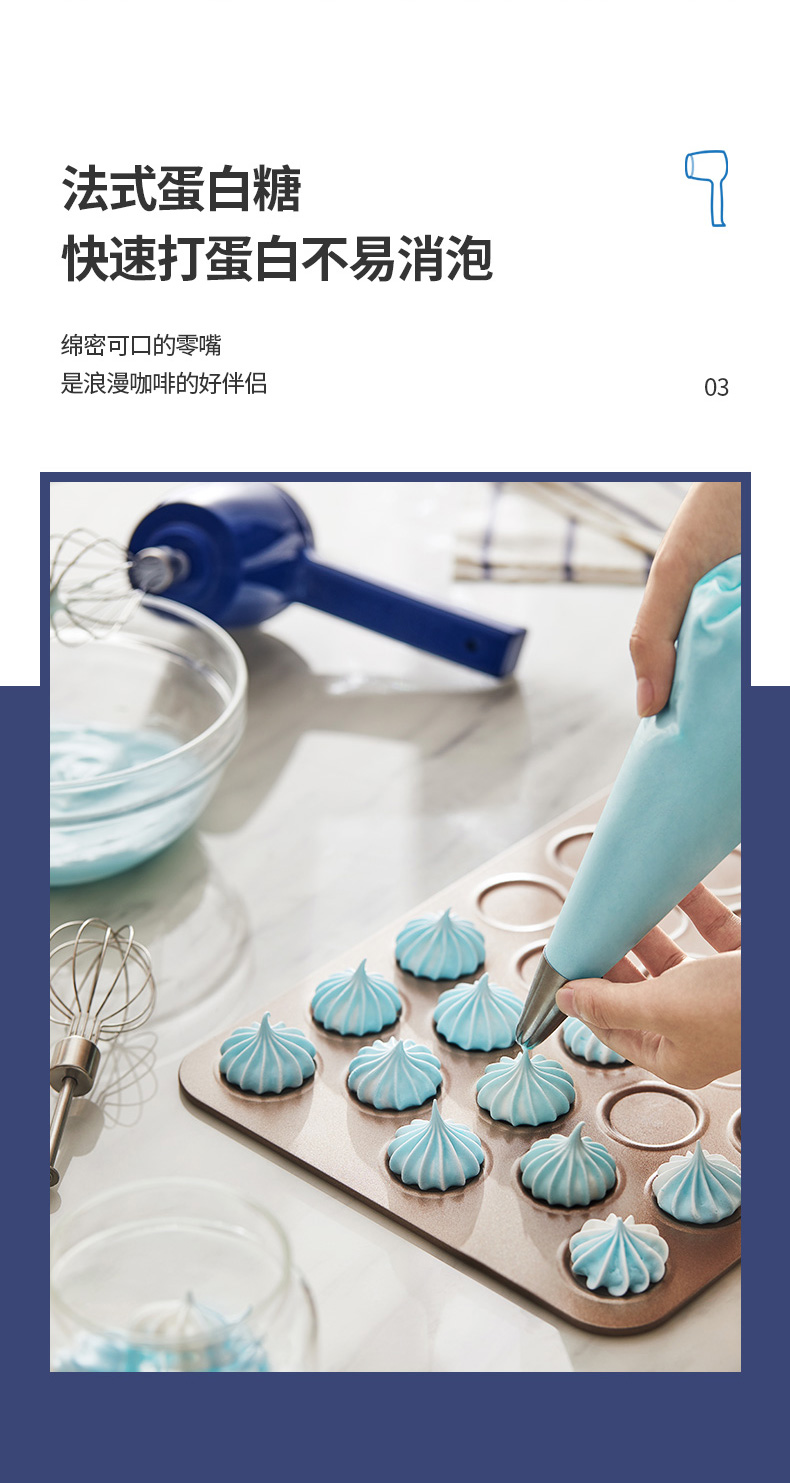 充滿電可連續(xù)工作約12次(4個蛋清,每次約4分鐘);人性化設(shè)計;無線使用,擺脫電源線約束,打蛋自由隨你選;舒適把手:單手打攪不費力;雙棒配置:長形攪拌網(wǎng),燈籠狀打奶網(wǎng);304不銹鋼雙網(wǎng);簡單更換安裝:1.網(wǎng)棒對準(zhǔn)孔位插入 2.稍微用力一推聽到“咔”一聲,就裝好了 3.使用后網(wǎng)棒撥出即可。